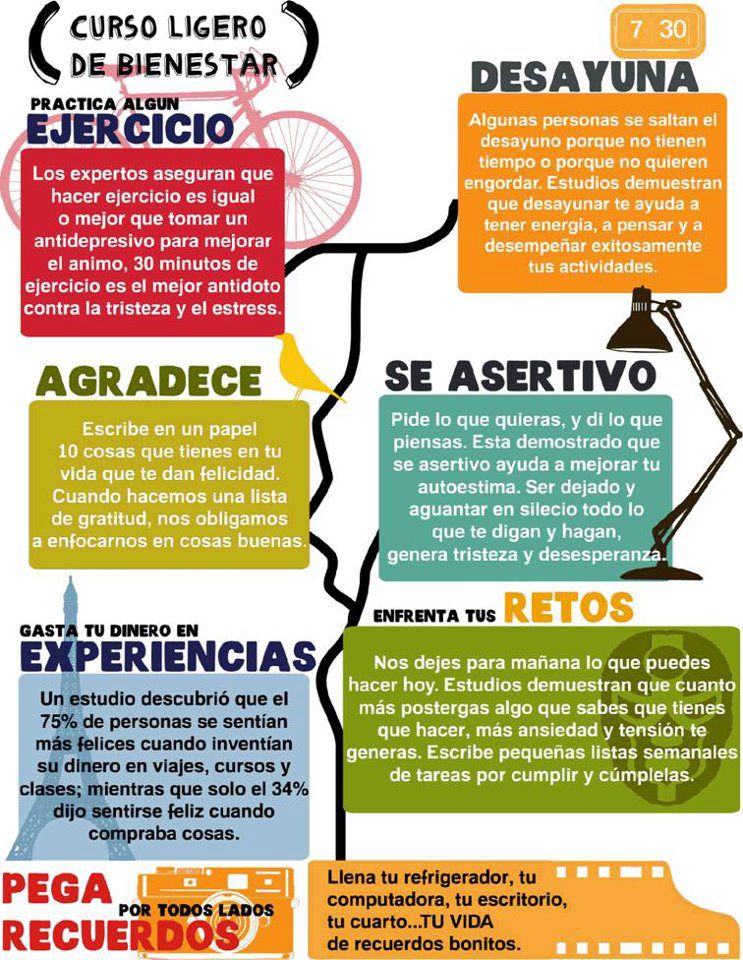 Poner en práctica todos los consejos que damos no es fácil. Más bien todo lo contrario. Navegando por la red he encontrado esta infografía que plasma una muy buena estrategia (hay muchas otras) para poder conseguir eso que tanto nos esforzamos por transmitir a la gente: el bienestar…, que según la OMS también se engloba en la definición de salud. Estar físicamente sano y no sentirse sano (gozar de bienestar) no es compatible con el concepto de salud global.