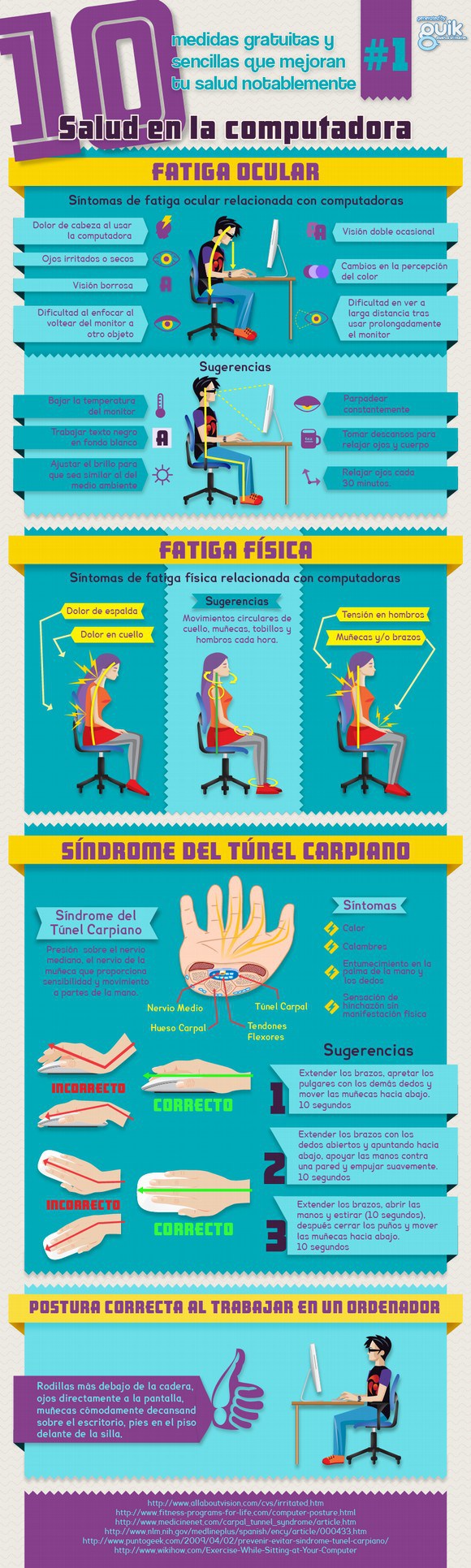 Aquí tenéis otra descriptiva infografía donde se describe en 10 puntos cómo afrontar una jornada laboral delante del ordenador sin que nuestro cuerpo salga perjudicado. Pequeñas rutinas de ejercicio pueden evitarnos muchos problemas: