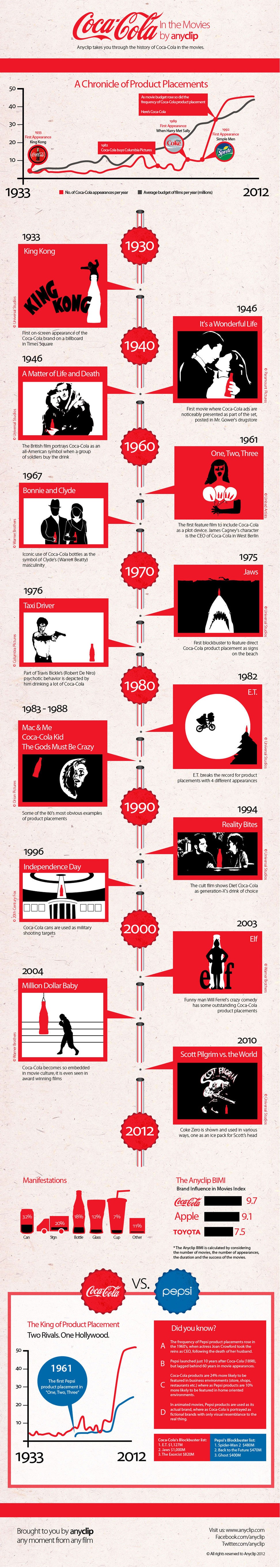 Coca-Cola se lleva la palma en el uso de la publicidad por emplazamiento. En la siguiente infografía, obtenida de un artículo escrito por Christina Warren se ilustra como la empresa ha venido utilizando la imagen de su marca para promoción de sus productos.