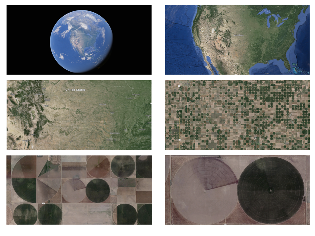 Desde el GoogleMaps se pueden observar en algunas zonas de USA unos círculos de casi 1 km de diámetro. No se trata de señales de aterrizaje de OVNIs. Son campos de cultivo de agricultura extensiva. ¿El modelo agrícola del futuro? Puede que no. (elPiscolabis)