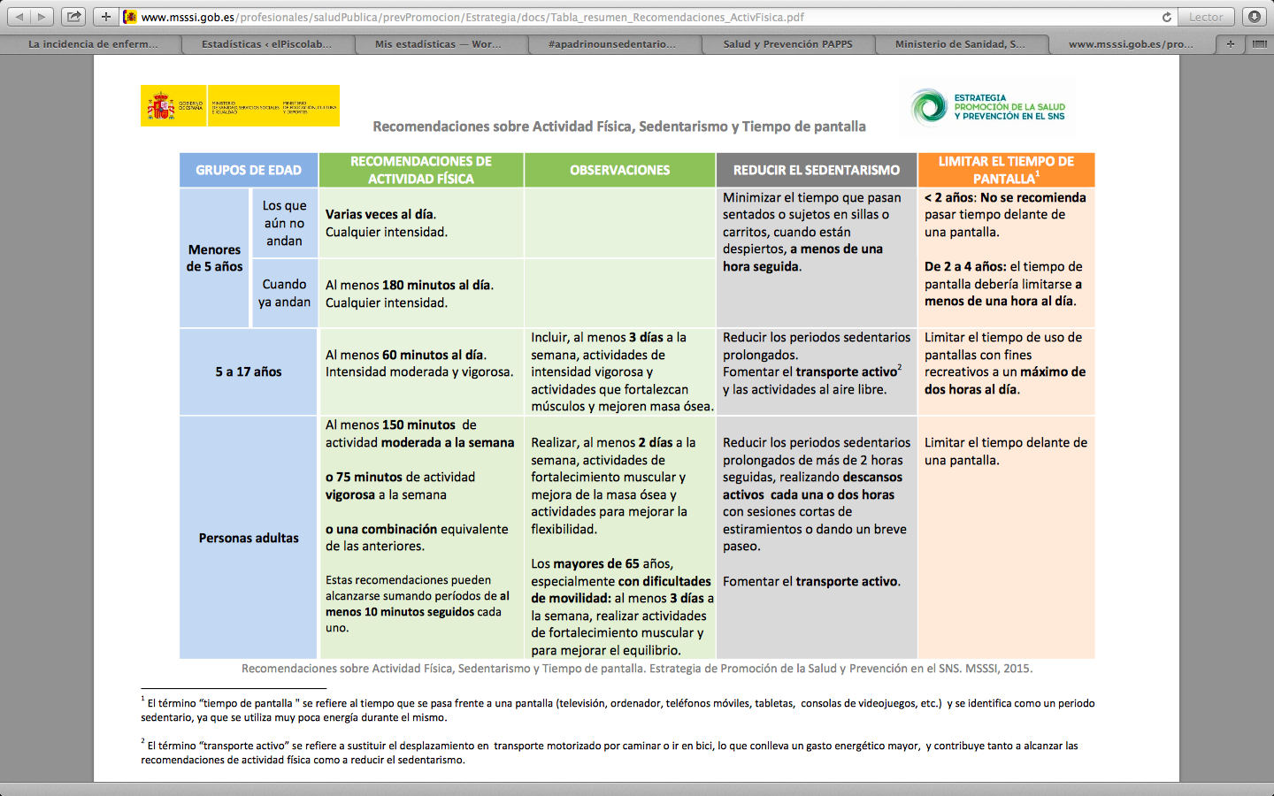 En el cuadro anterior, del Ministerio de Sanidad, podrás estimar el nivel de actividad física de niños, adolescentes y adultos. Aquí el enlace.